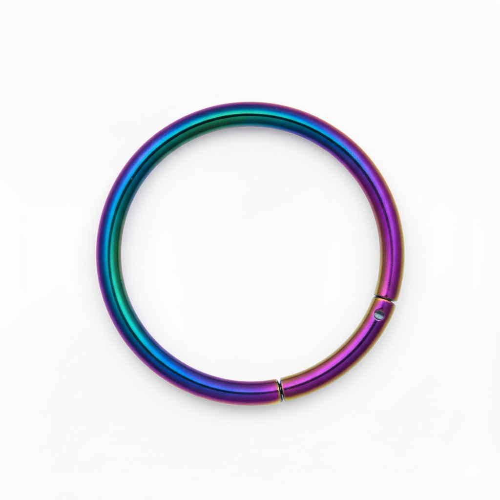 Argolla clicker sinfin tornasol confeccionada en acero quirúrgico inoxidable. Diseño minimalista con sistema de cierre clicker que permite abrir y cerrar fácilmente, brindando seguridad y comodidad para el uso diario.