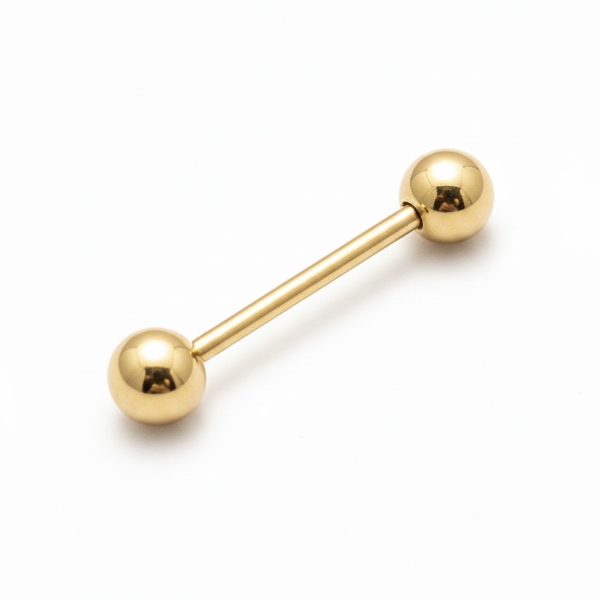 Barra básica dorada para tongue (lengua) confeccionada en acero quirúrgico inoxidable, apto para uso diario. Cuenta con dos esferas a rosca en ambos extremos, permitiendo una colocación fácil, cómoda y segura. Disponible en diferentes colores, medidas y diseños.