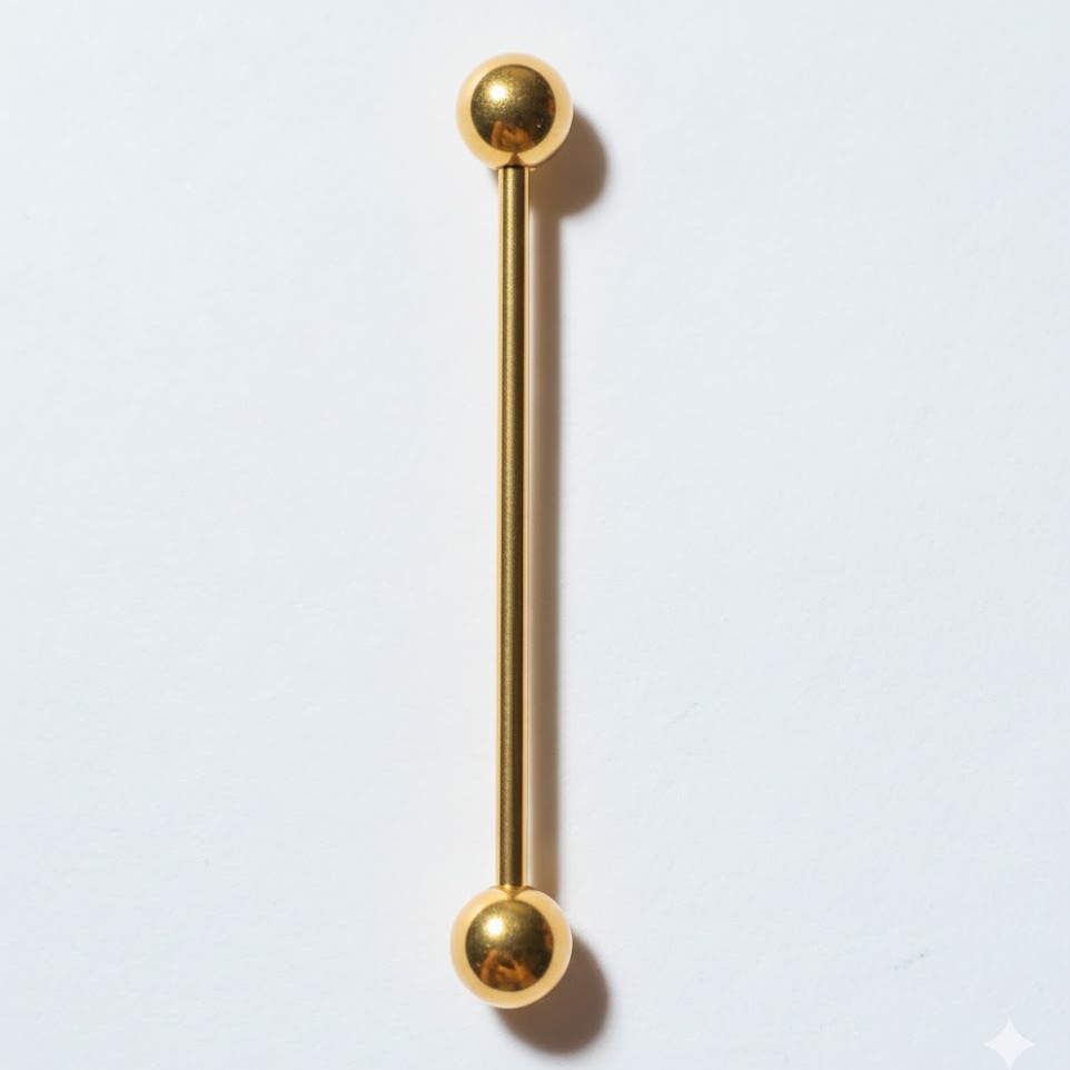 Barra básica dorada para perforación de tipo “industrial” (oreja) confeccionada en acero quirúrgico inoxidable, apta para el uso diario. Cuenta con dos esferas a rosca en ambos extremos. Disponible en diferentes medidas y colores.