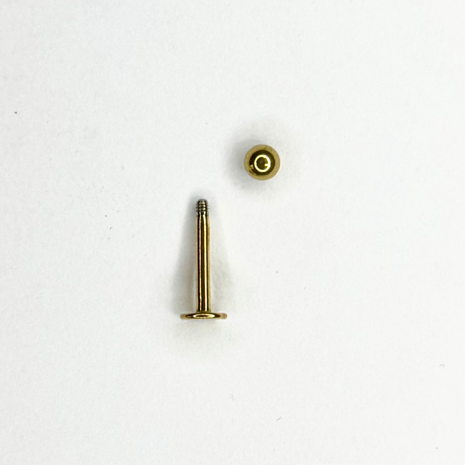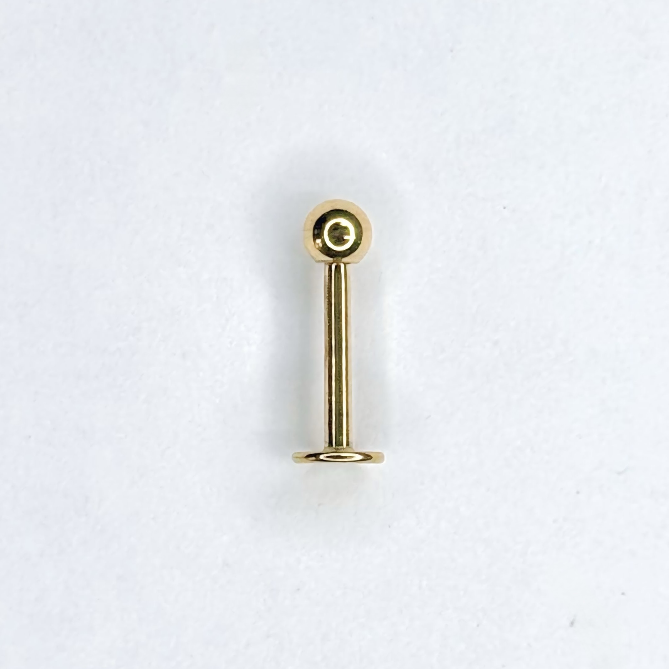 Labret básico dorado confeccionado en acero quirúrgico inoxidable. Diseño clásico y versátil de dos piezas, ideal para perforaciones de oreja, labio, trago o cartílago. Cuenta con cierre a rosca externa y base plana. Disponible en medidas de 6mm, 8mm, 10mm y 12mm.