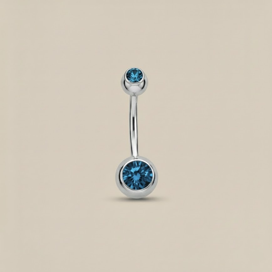 Joyería para ombligo confeccionado en acero quirúrgico inoxidable. Presenta un diseño color plateado con barra curva y detalles de piedras strass celeste. Cuenta con cierre a rosca para mayor seguridad y comodidad en el uso diario.