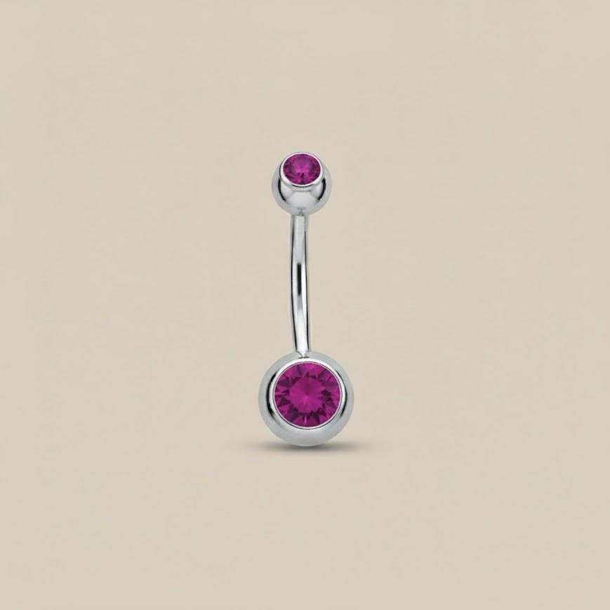 Joyería para ombligo confeccionado en acero quirúrgico inoxidable. Presenta un diseño color plateado con barra curva y detalles de piedras strass fucsia. Cuenta con cierre a rosca para mayor seguridad y comodidad en el uso diario.
