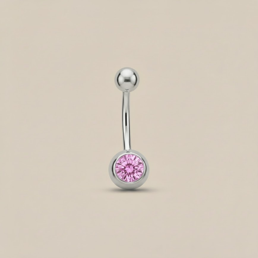 Joyería para ombligo confeccionado en acero quirúrgico inoxidable. Presenta un diseño color plateado con barra curva y detalle de piedra strass rosado. Cuenta con cierre a rosca para mayor seguridad y comodidad en el uso diario.